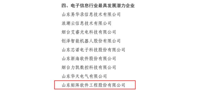 近日,山東省信息產(chǎn)業(yè)協(xié)會、山東電子學(xué)會聯(lián)合公布了2019年山東省電子信息行業(yè)優(yōu)秀企業(yè)名單,山東矩陣軟件憑借在全省電子信息行業(yè)的突出貢獻(xiàn)順利入選,被評為2019年山東省電子信息行業(yè)優(yōu)秀企業(yè)“最具發(fā)展?jié)摿ζ髽I(yè)”榮譽(yù)稱號。